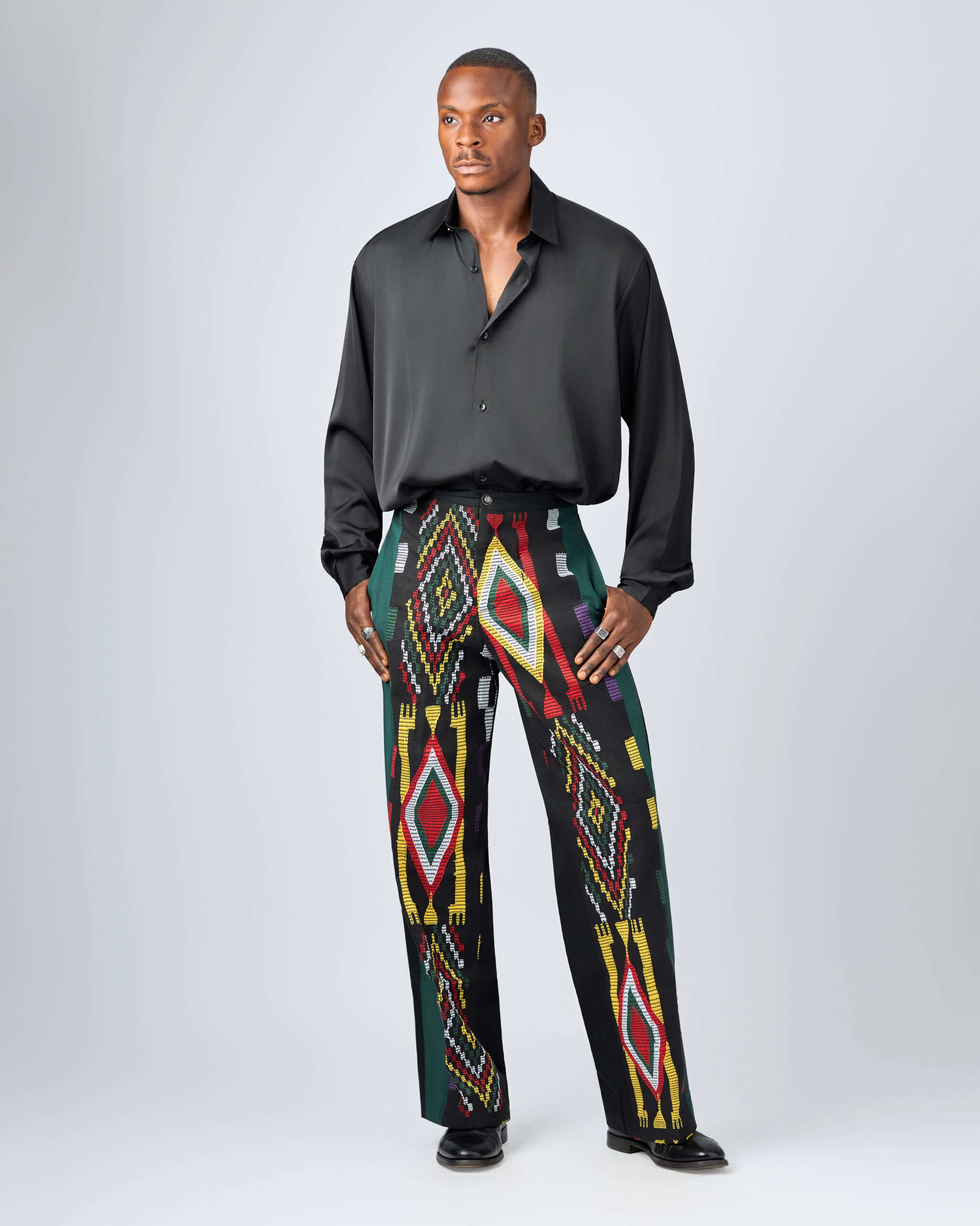The Akwete fabric, once woven by skilled Igbo women as a mark of prestige, now flows boldly against the softness of modern cotton. Each geometric line glows like a coded legacy, a silent declaration of pride and identity. Ancestral Lines is not just a pant — it’s a movement; a conversation between culture and couture, where every thread carries the voice of tradition into the future.