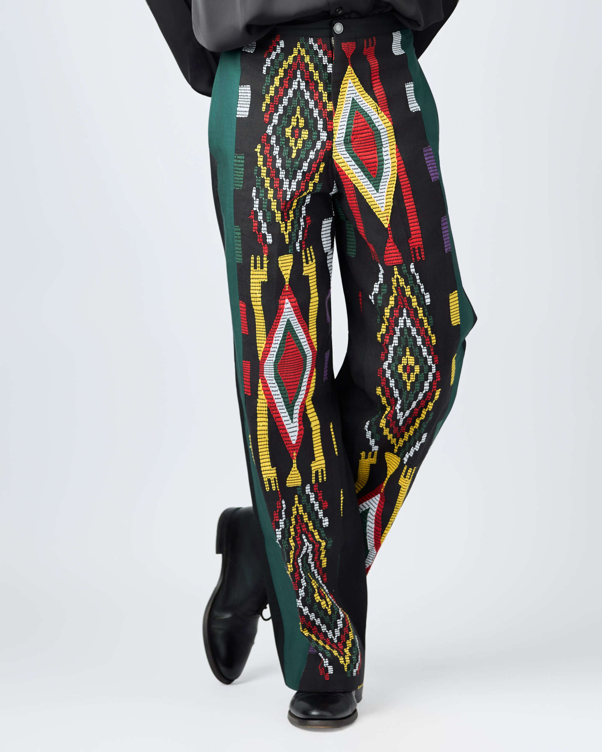The Ancestral Lines trousers redefine modern heritage wear through the fusion of Igbo Akwete fabric and plain cotton. The structured silhouette features a wide-leg cut with side pockets and a back suit-style pocket, blending tradition with functionality. The striking Akwete panels at the center front act as a visual heartbeat — each woven motif narrating stories of strength, culture, and artistry. Tailored yet expressive, this piece balances craftsmanship and modern minimalism, creating a timeless bridge between past and present.