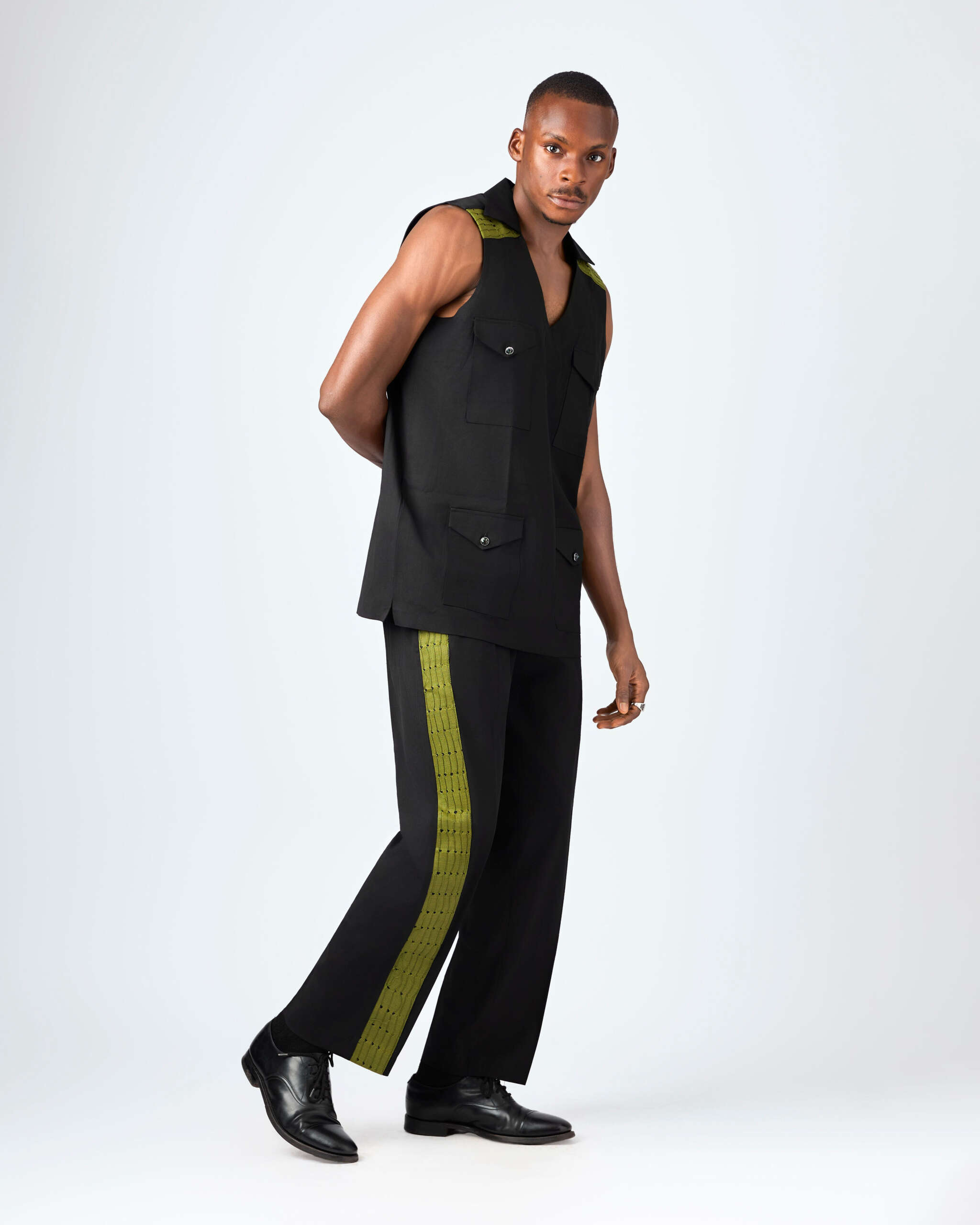 The Emerald Dynasty Noir takes the essence of the original and cloaks it in a deeper, bolder mood. Rendered in sleek black linen with Aṣọ-Òkè accents, it speaks of quiet power and