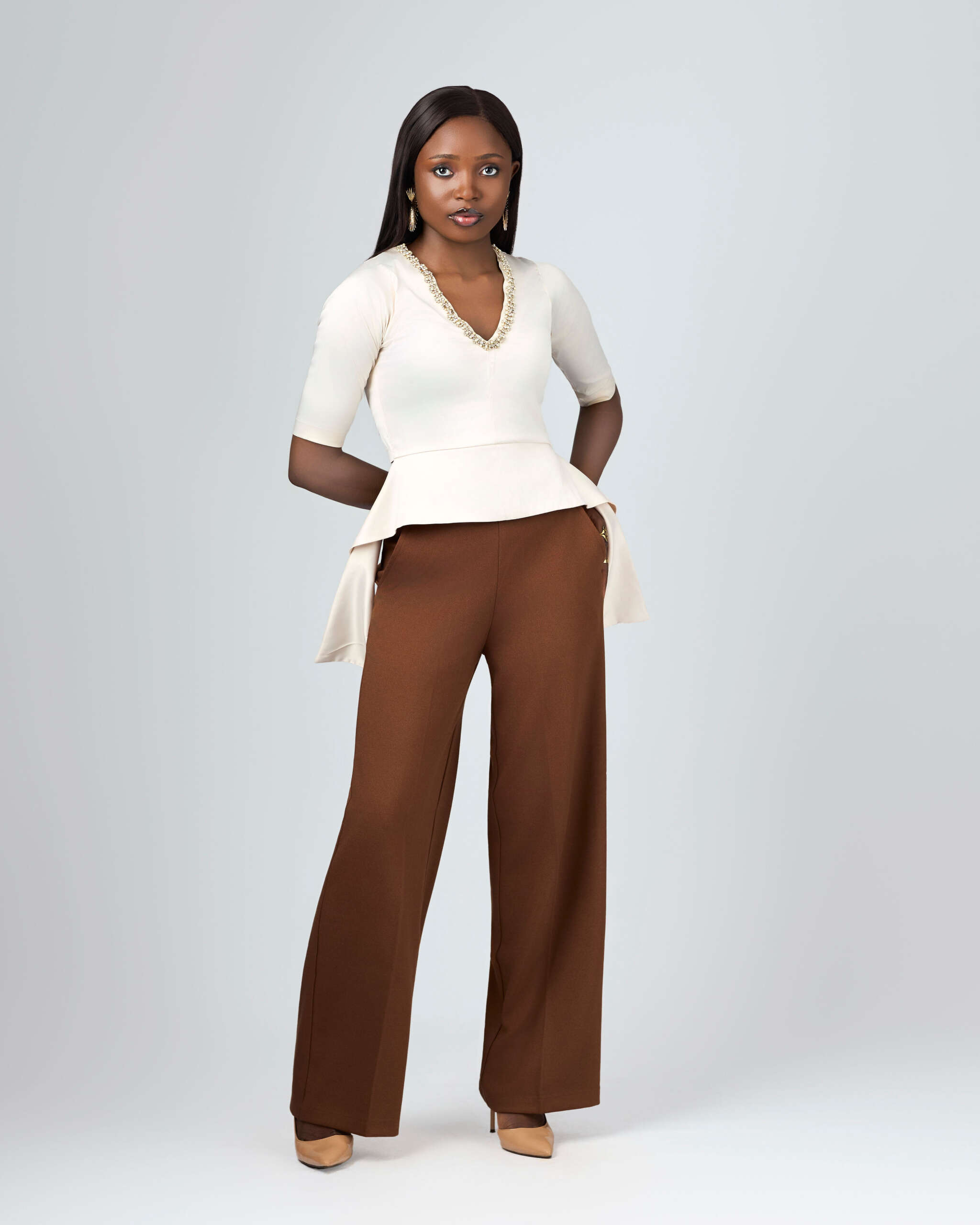The top, in a luxurious off-white hue, features the signature V-neckline and subtle gold-toned embellishments, offering a warm glow to your complexion. Its gracefully flowing high-low peplum hem provides a contemporary edge while maintaining timeless appeal. Complementing the top are the rich, wood brown wide-leg trousers, which drape elegantly and offer both comfort and style. The Ivory Wood Monarc Set is ideal for those who appreciate refined aesthetics with a touch of organic charm, perfect for both day-to-day sophistication and polished gatherings.