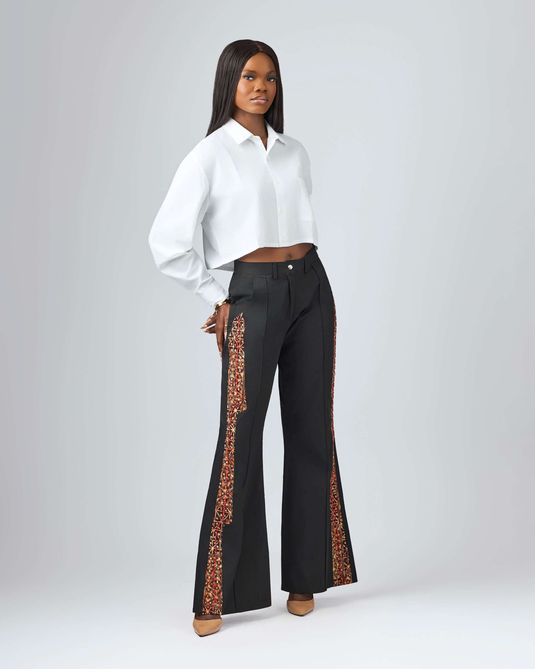 traditions — Mali’s storytelling textile and Igboland’s symbolic adornment — harmonizing into one design. The boot cut silhouette modernizes the piece, making it versatile for today’s runway or street style while carrying centuries of meaning.