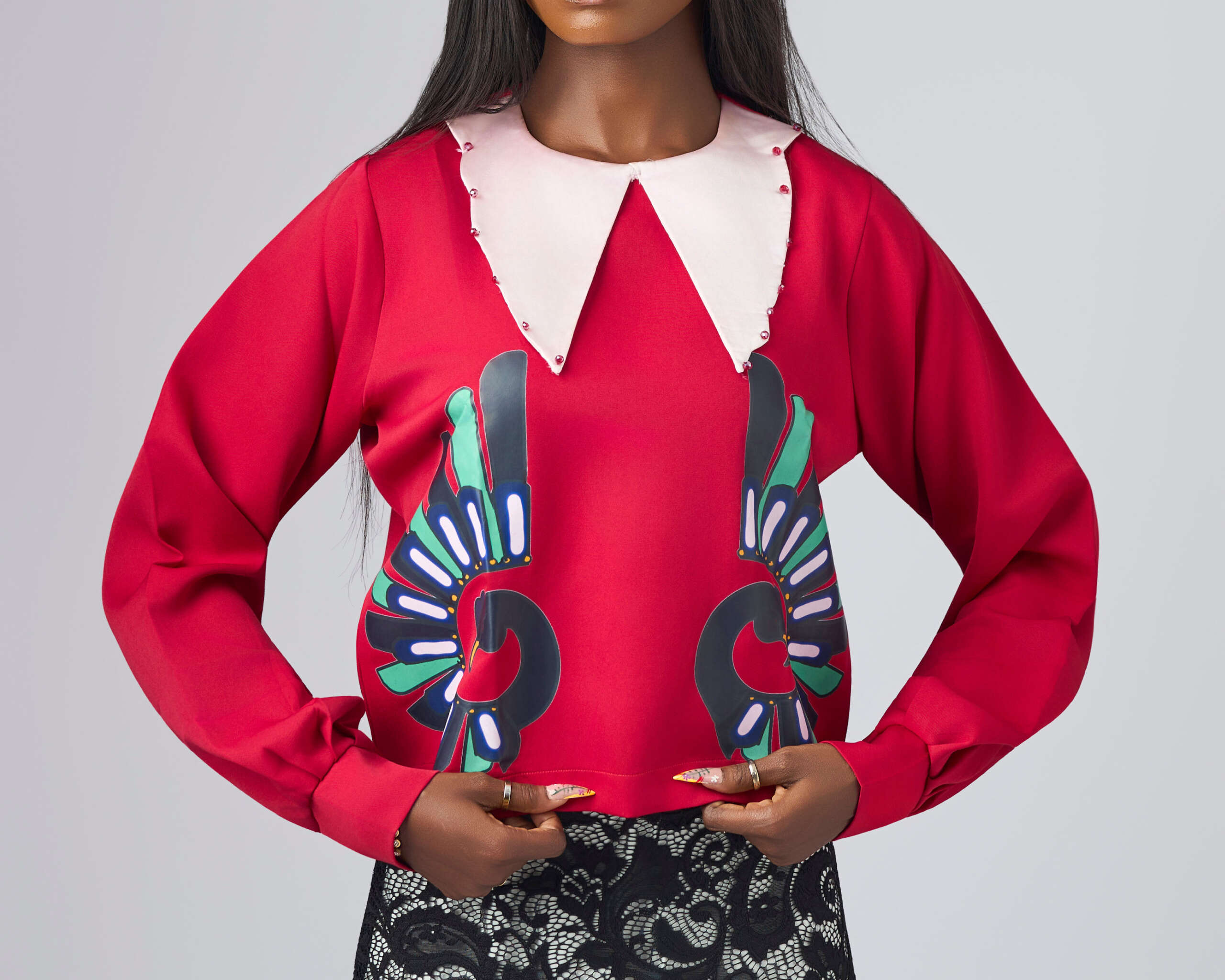 Step into a world of vibrant expression with the Peacock Box top. This distinctive piece reimagines classic elegance with a playful, artistic flair. Made in a rich, eye-catching red, the top