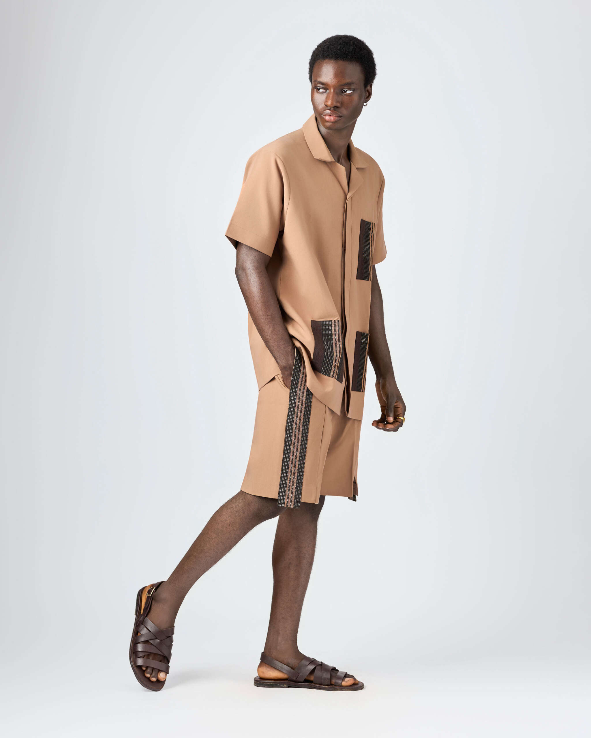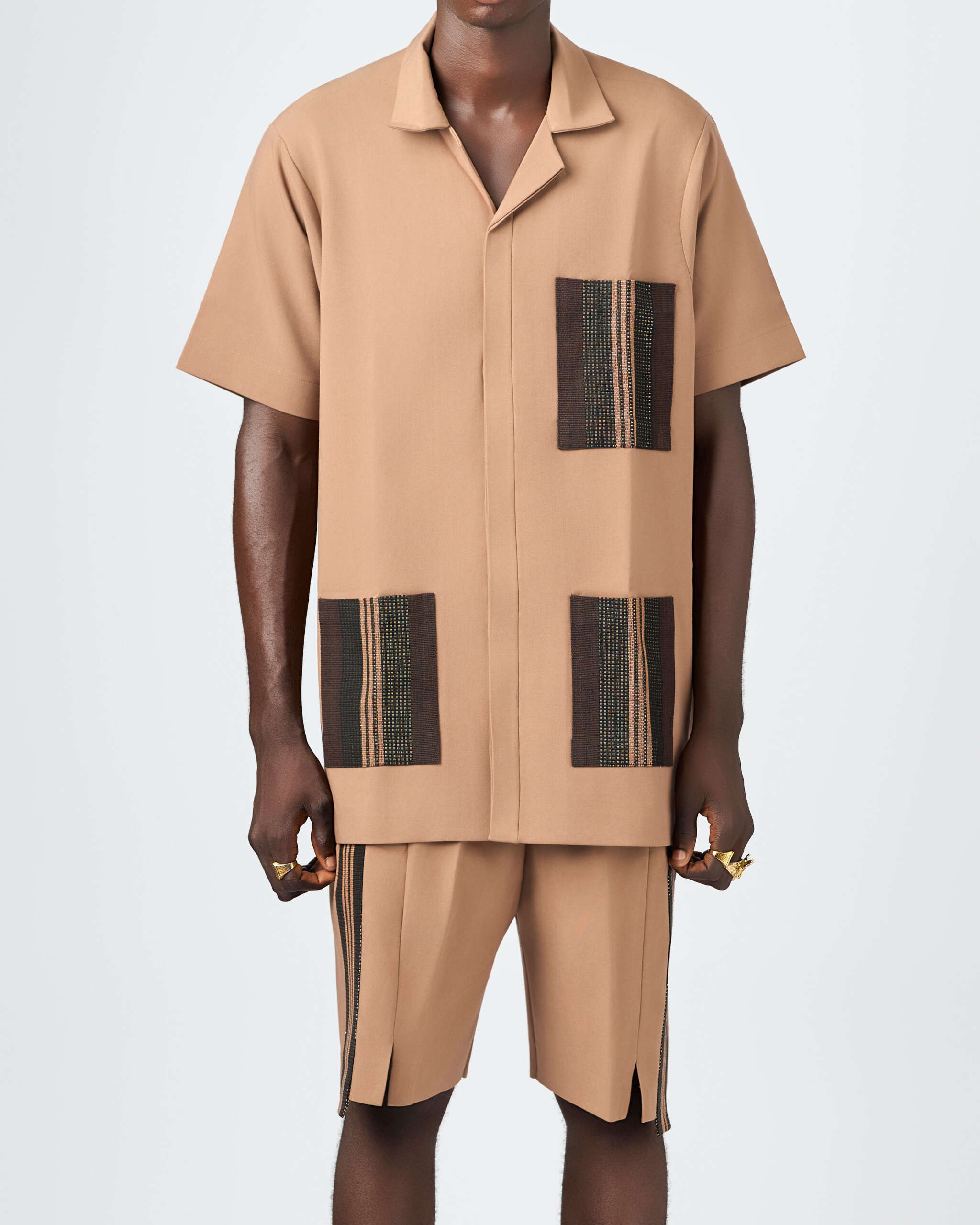 The blend of neutral linen and vibrant Aṣọ-Òkè creates a balanced dialogue between tradition and modern ease. The small triangular cut at the base of the shorts adds an avant-garde touch — a symbol of distinction and bold individuality.