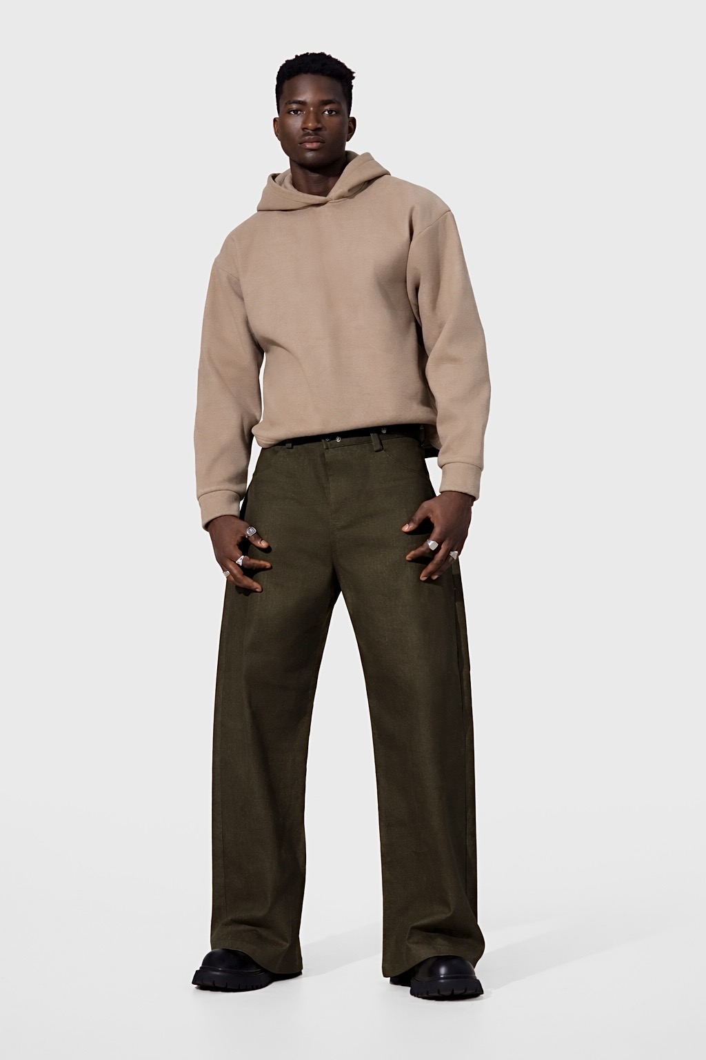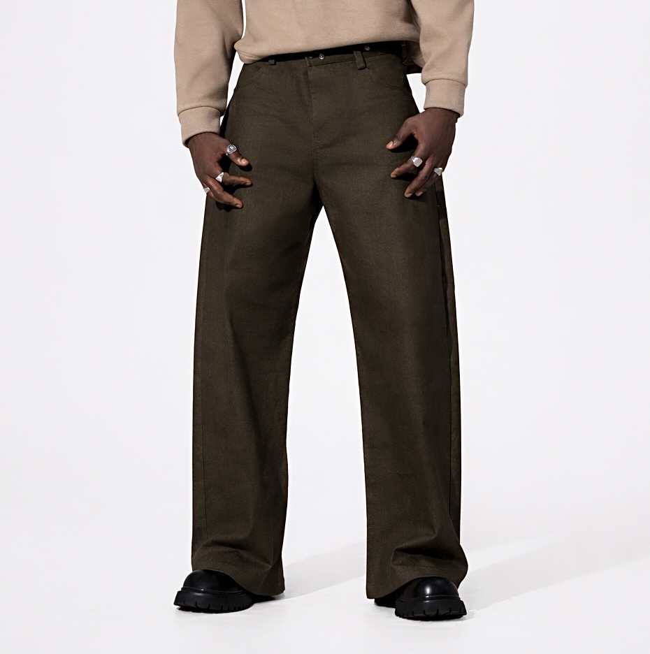 Rendered in a deep dark olive green, the tone reflects persistence and grounded strength—subtle yet commanding. Its wide-leg cut introduces balance and presence, while the clean finish and precise tailoring emphasize discipline in design. Originally part of a detachable two-piece construction, the pants maintains its integrity when worn alone—offering versatility without losing its identity.