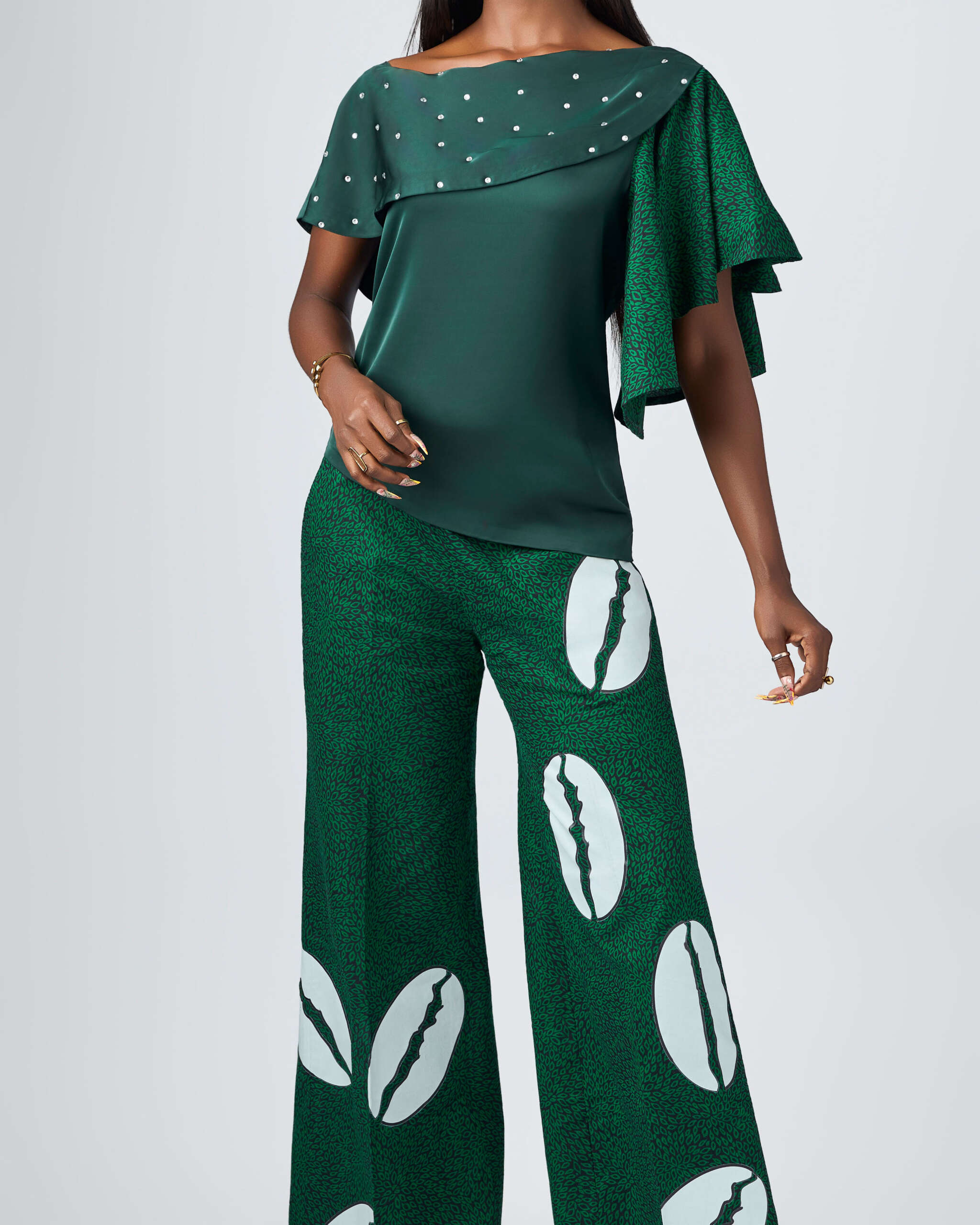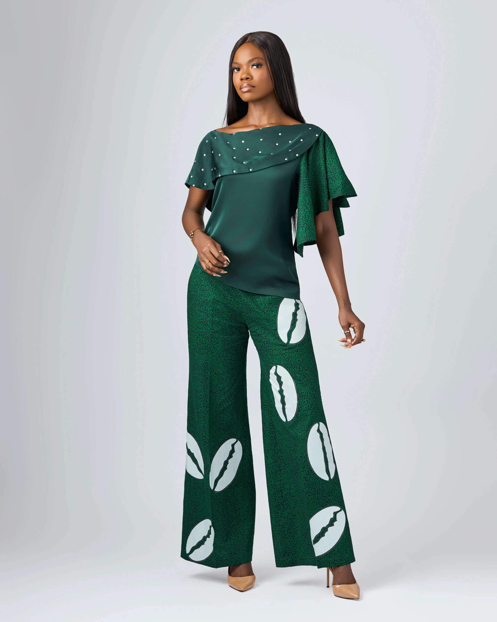 The emerald green silk top with its off-shoulder draped sleeve and African stone embellishments mirrors sophistication, while also paying homage to the richness of the continent’s natural resources. The emerald hue reflects growth, wealth, and fertility — values embedded in African cosmology.