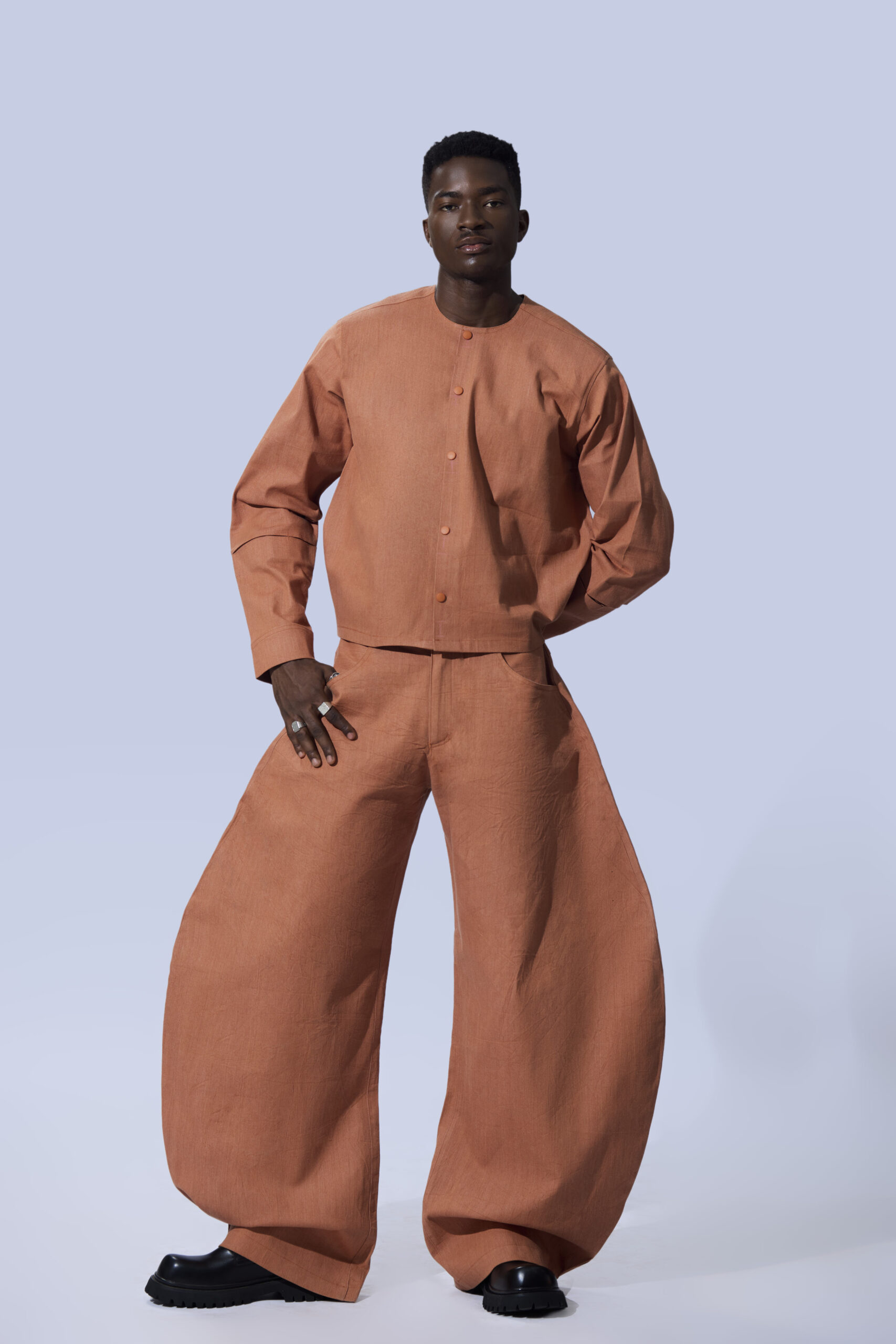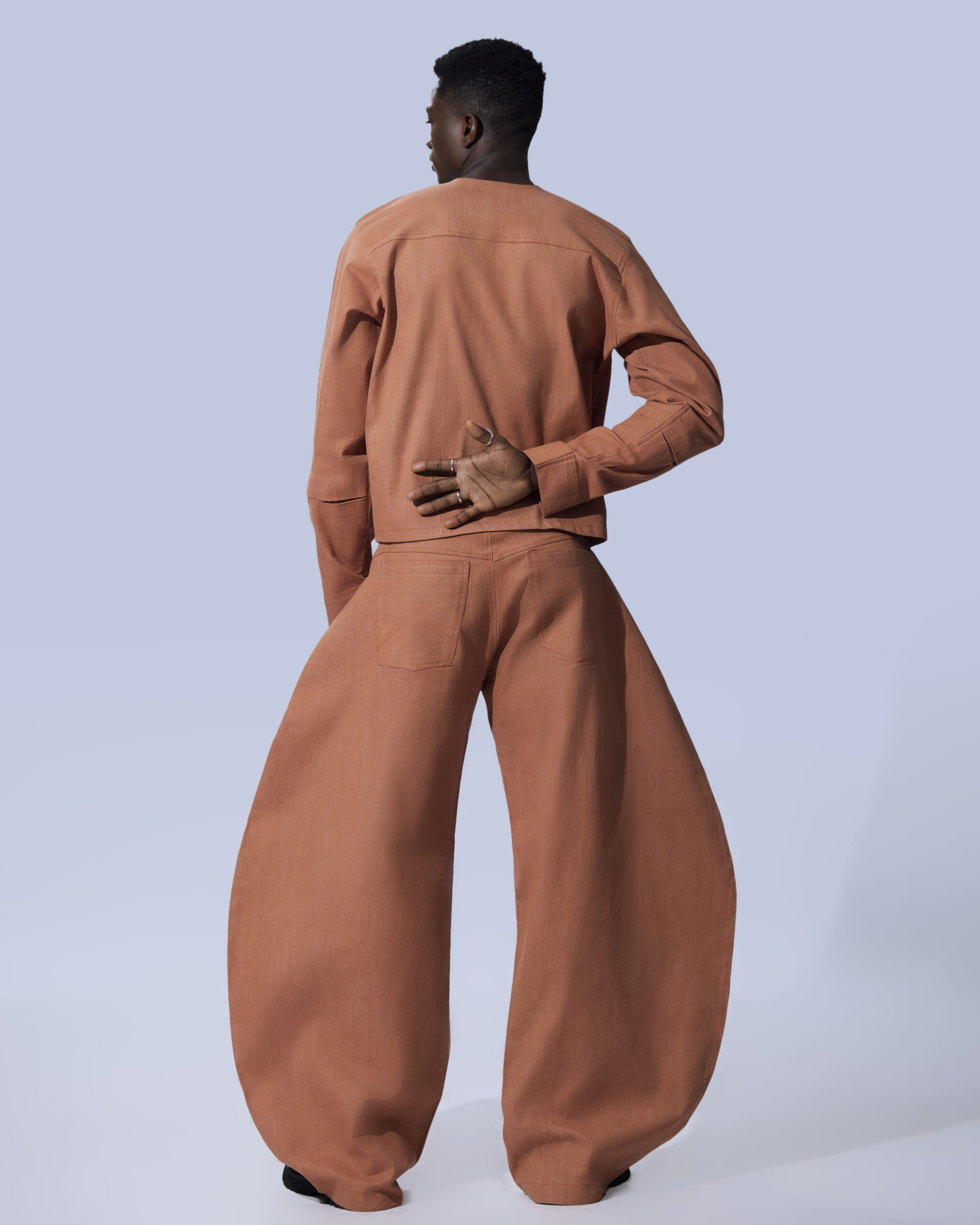 The trousers mirror the rounded, intentional curves of handcrafted forms—an ode to patience, craftsmanship, and rooted identity. Paired with a structured buttoned top, the set creates a balanced silhouette that feels both grounded and refined.